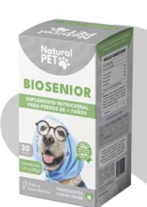 BIOSENIOR es un suplemento con vitaminas y minerales elaborado por Natural PET by FNL para perros senior mayores de 7 años. Está indicado para caninos como fortalecedor cerebral, también mejora la función cognitiva y las habilidades del aprendizaje, actúa como soporte y mantención nutricional que lo protegen del envejecimiento.