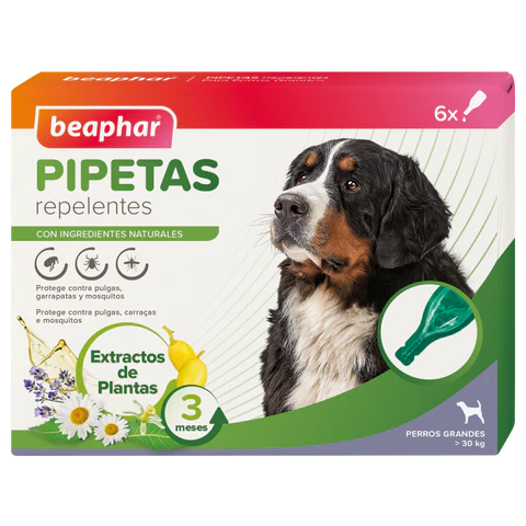 Las Pipetas Repelentes Beaphar ofrecen protección natural para perros contra pulgas, garrapatas, mosquitos y otros insectos. Su fórmula con extracto de margosa (aceite de neem) y aceite de lavandín actúa como repelente efectivo, además de aportar un aroma agradable.