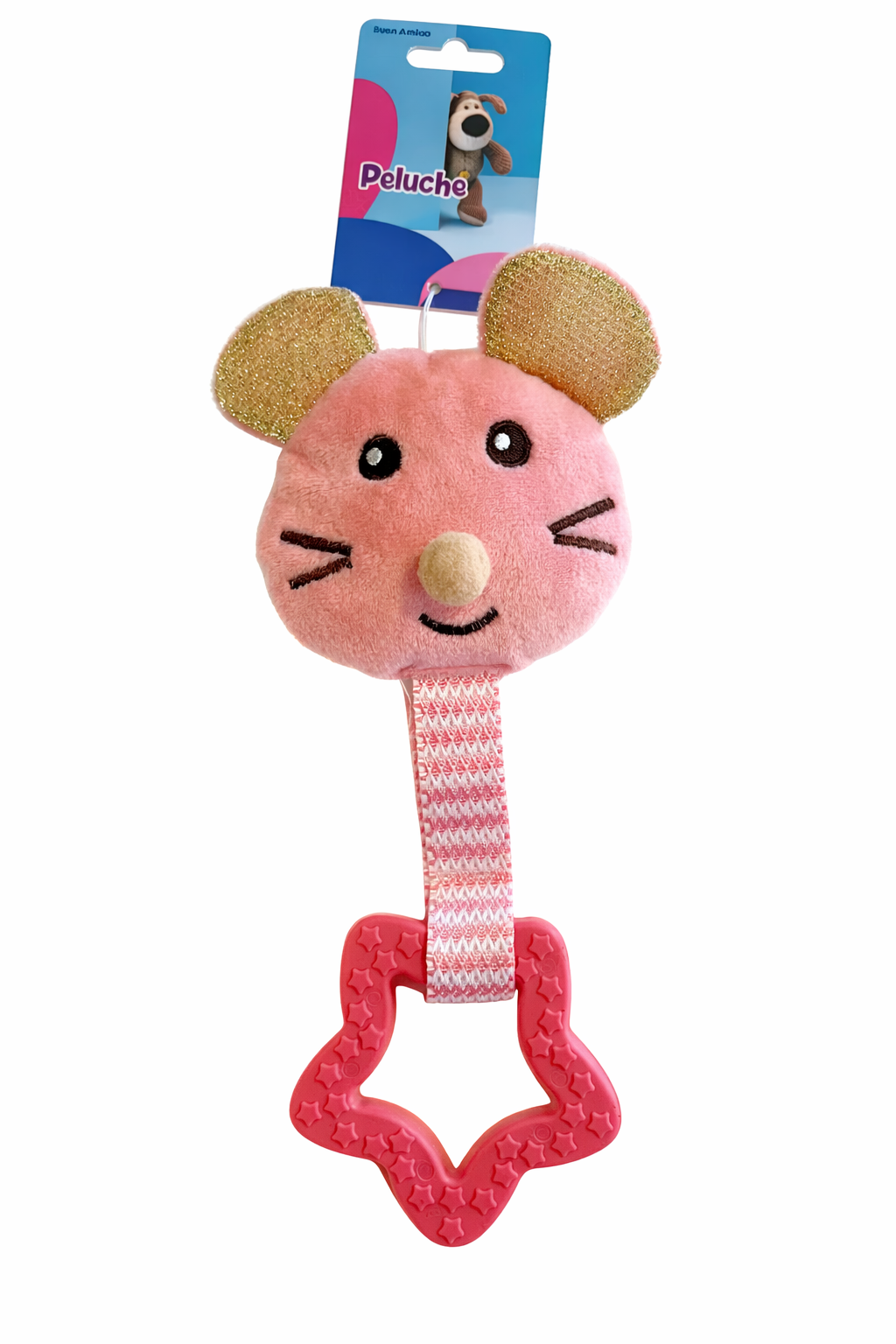 Divertido juguete para mascotas con suave cabeza de peluche en forma de ratoncito y mordedor de goma con textura en forma de estrella. Su diseño combina diferentes materiales que estimulan el juego y ayudan a satisfacer la necesidad natural de morder. Ideal para entretener a tu mascota mientras limpia suavemente sus dientes y encías. Además, su tamaño es perfecto para que tu peludo lo lleve y juegue fácilmente.