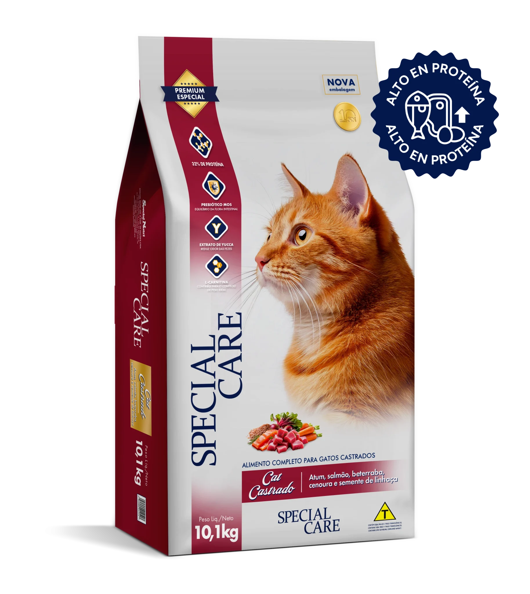 Special Care Gato Castrado 10 kg es un alimento seco completo y equilibrado, especialmente formulado para gatos adultos esterilizados o castrados, ayudando a mantener un peso saludable, una buena digestión y una óptima calidad de vida después de la esterilización.