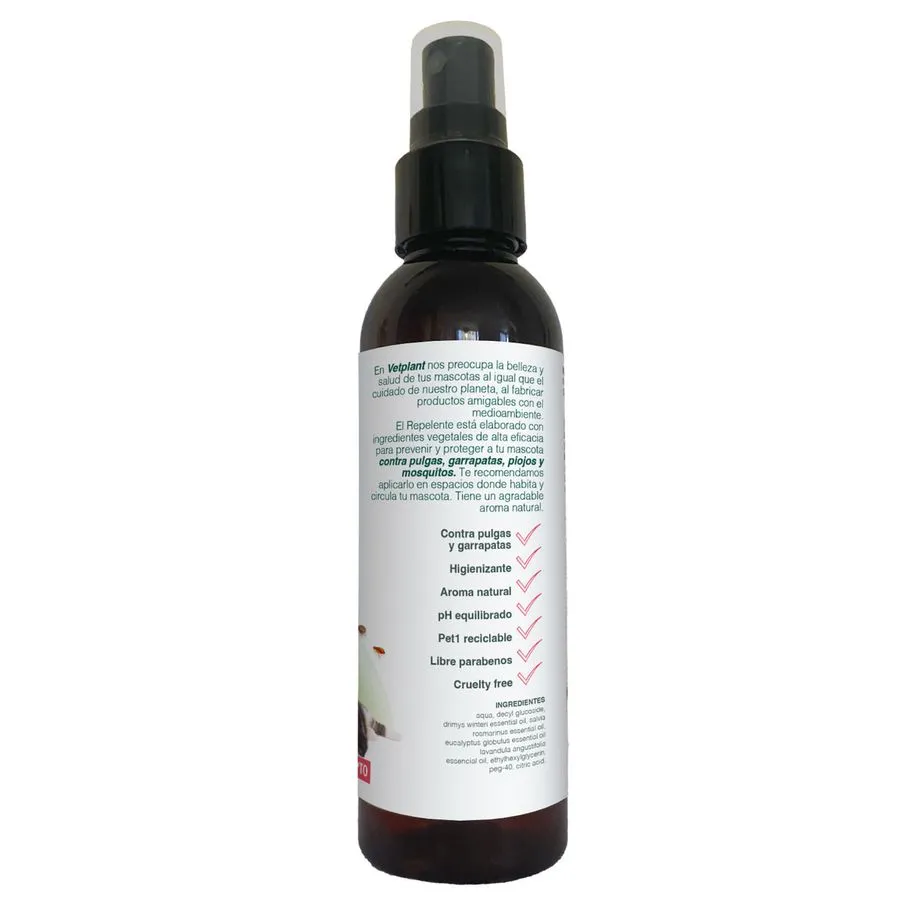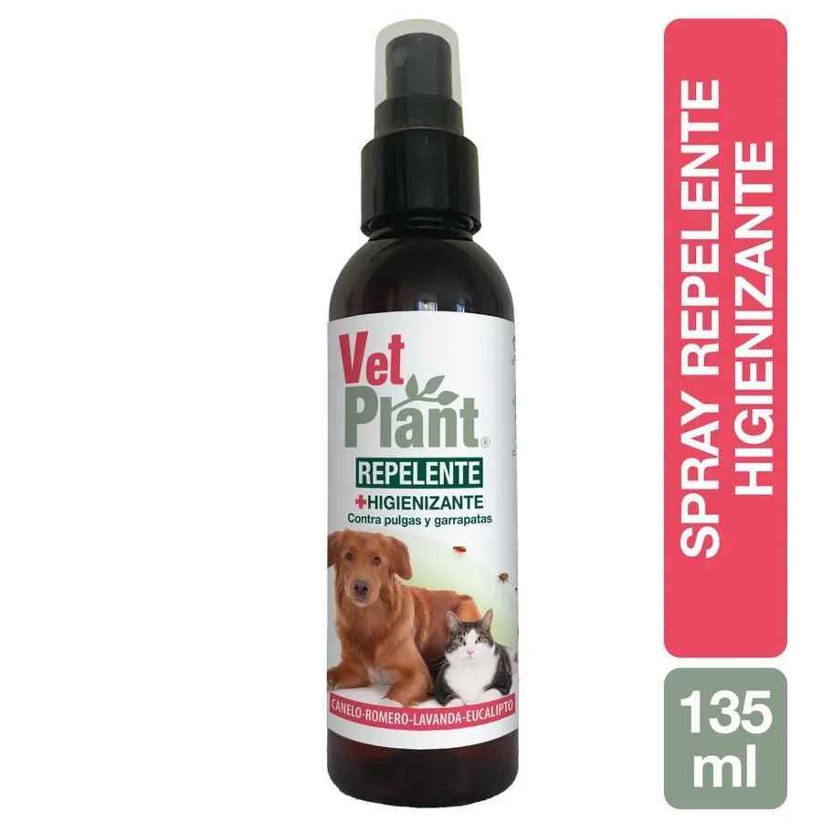Protege a tus mascotas de forma natural con el Spray Repelente VetPlant. Su fórmula ecológica con extractos de canelo, romero, lavanda y eucaliptus actúa como una barrera aromática que ayuda a repeler insectos y ectoparásitos, sin dañar la piel ni el entorno. Ideal para perros, gatos y el hogar, ofrece una alternativa segura y libre de químicos tóxicos.